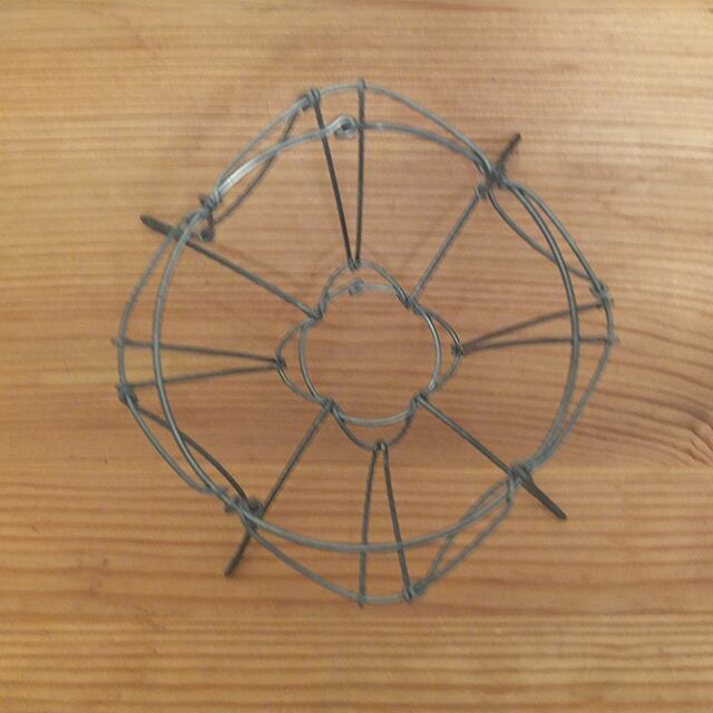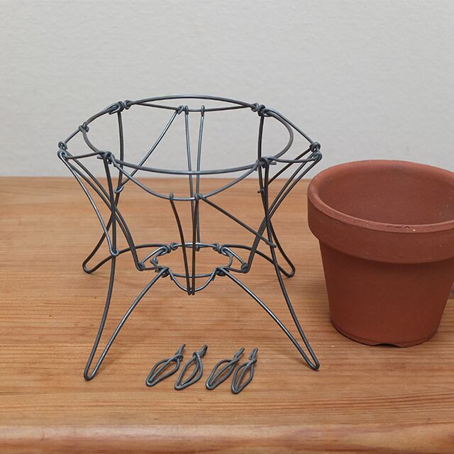 テラコッタ(素焼き)3号鉢がセットされた、ワイヤーの鉢カバーです。3号鉢というのは、園芸店で売られている一般的な黒のビニールポットが一つだけ植え込める大きさで、多肉植物ならともかく草花の寄せ植えにはちょっと向かないサイズですね。